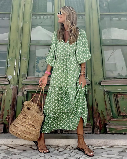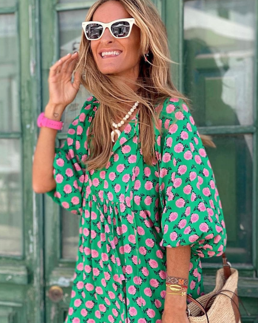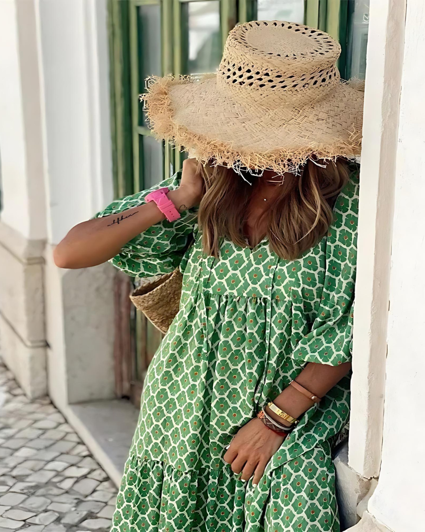 Oppdag vår moderne fritidskjole i Bomullsblanding — en drøm av komfort og pusteevne for varme dager. Den løse passformen med vakkert grønt mønster gir en avslappet og trendy sommerlook. Ideell til hverdagsbruk, ferie eller leisurely helger. Kombiner med sandaler eller sneakers for en uanstrengt, men elegant stil. Et must-have plagg som gir både stil og velvære i garderoben.