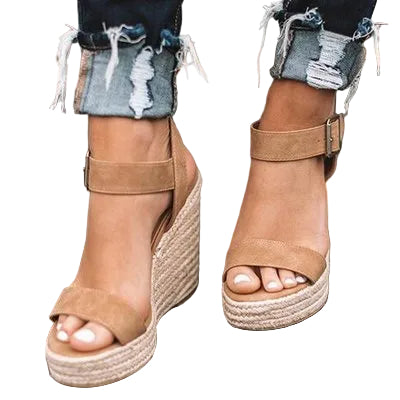 Sandaler med åpen tå gir en flatterende silhuett som hever enhver sommergarderobe. Den rene stroppdesignen og glatte finishen tilfører et moderne preg, mens den stabile kilebasen og ankelstroppen sikrer komfort hele dagen.